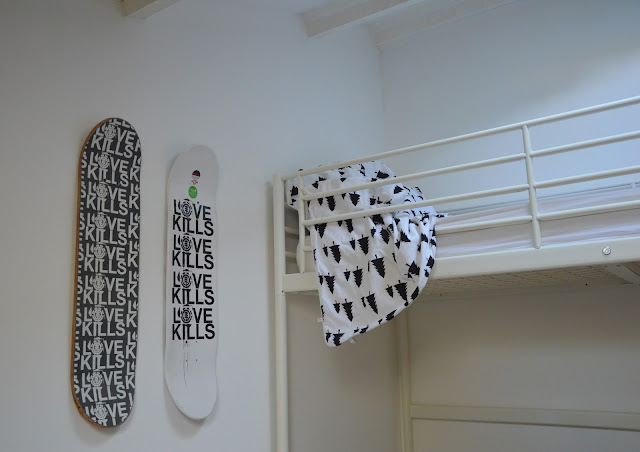 Een heerlijk licht kamertje. We kozen ervoor om ook hier alles wit te verven en te lakken, aangevuld met enkele zwarte details. Als eyecatcher doet de brute natuurstenen muur genoeg. De kids vullen graag aan met hun eigen 'eyecatchers'; op hun vraag werden er dan ook wat detailfoto's in de kamer genomen en hier mee gepost ... ;-) De bedden hadden we al en namen we mee uit België, want het zijn de ideale (en tevens de enige Ikeameubels in ons huis!), handige plaatsbespaarders, met ingebouwde kisten onder het ene bed en een hoogslaper met bureau bij het andere bed. Ook de Qualy haakjes (hier) en de skateboarddecks (uit Lagos, hier), als aandenken aan ons jaartje weg, verhuisden we mee.